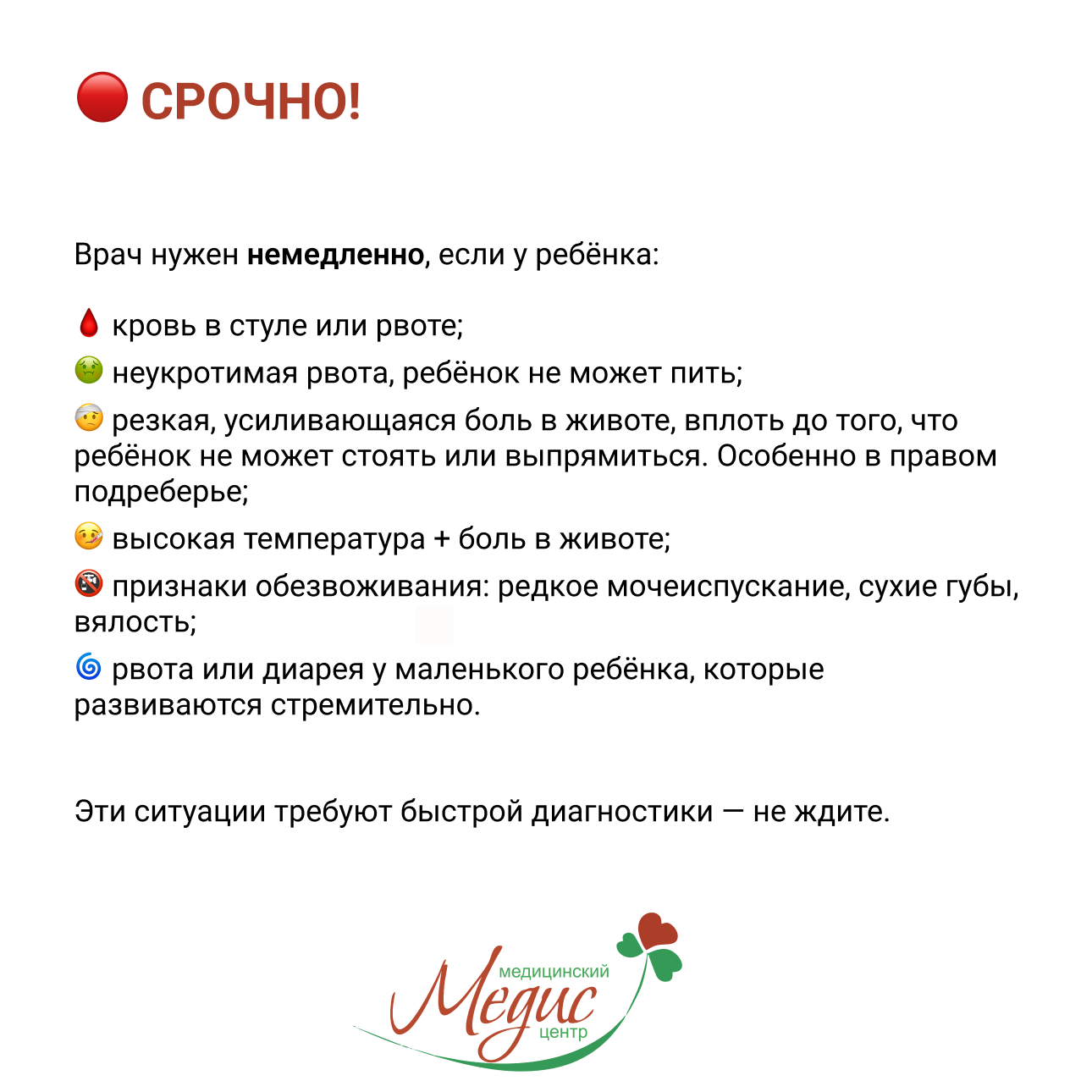🌀 рвота или диарея у маленького ребёнка, которые развиваются стремительно.